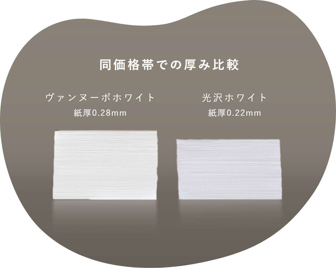 紙厚0.28㎜の中に空気を多く含むため、軽くて厚みがあります。また、名刺作成のファーストが扱う用紙の中でも厚めの部類となり、手軽に存在感や高級感を表現できます。