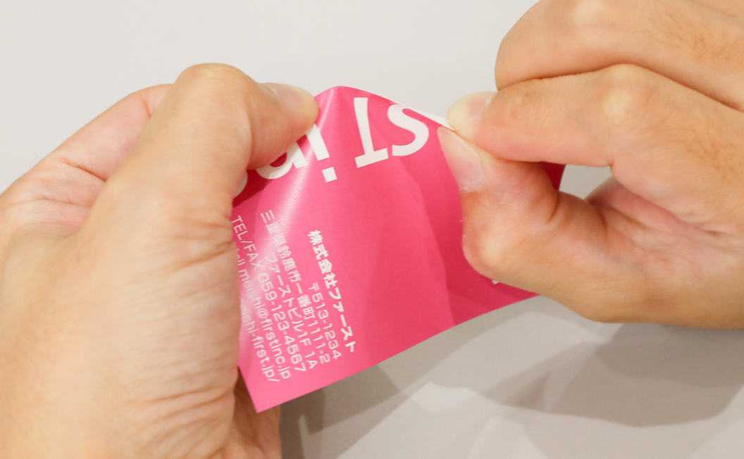 紙の場合、湿気によっては反ってしまうことがあります。フィルムはカールすることがなく、保管場所を選びません。雨の日でも心配なく相手に渡す事が出来ます。