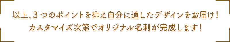以上、3つのポイントを抑え自分に適したデザインをお届け!カスタマイズ次第でオリジナル名刺が完成します!"/>