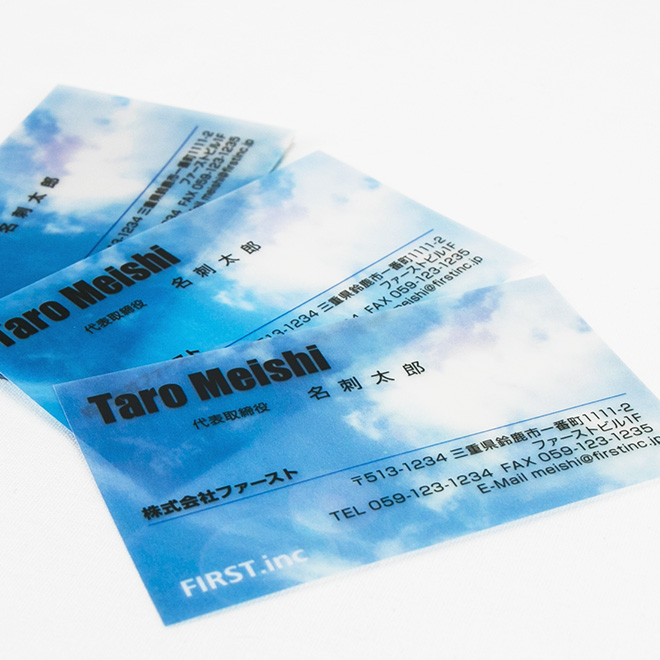 ミルクのような白色と透明感の風合いを持つ、フィルムタイプの名刺用紙です。写真やカラーのベタ塗りでも、綺麗に発色します!また、透明感と白色を活かしたシンプルデザインも綺麗に映えます!フィルムタイプだから、湿気や汚れに強く破れません。裏面も印刷可能ですが、反対面のデザインが透けて見えます。