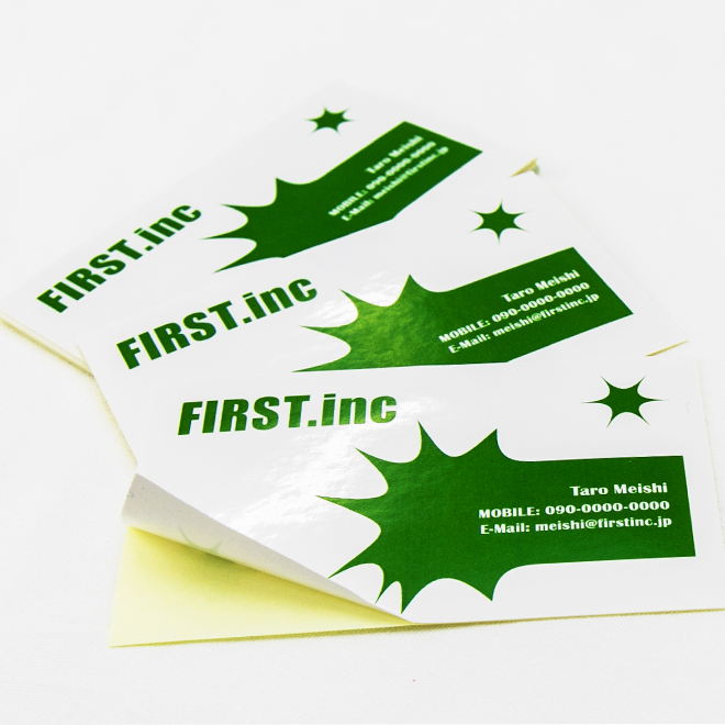 名刺をそのままステッカーにして個性を出したり、お店のロゴステッカーとして使用したり、クリアファイルに貼って営業用途に使用したりと、用途無限大の格安ステッカーです。表面は光沢があり、ツルっとしたステッカー用紙を使用しています。
